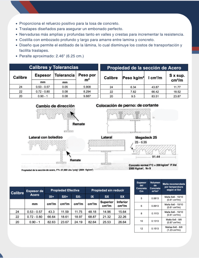 La lámina Megadeck es una solución avanzada en losas colaborantes. Fabricada con acero galvanizado (G60), su estampado permite una excelente adherencia al concreto.